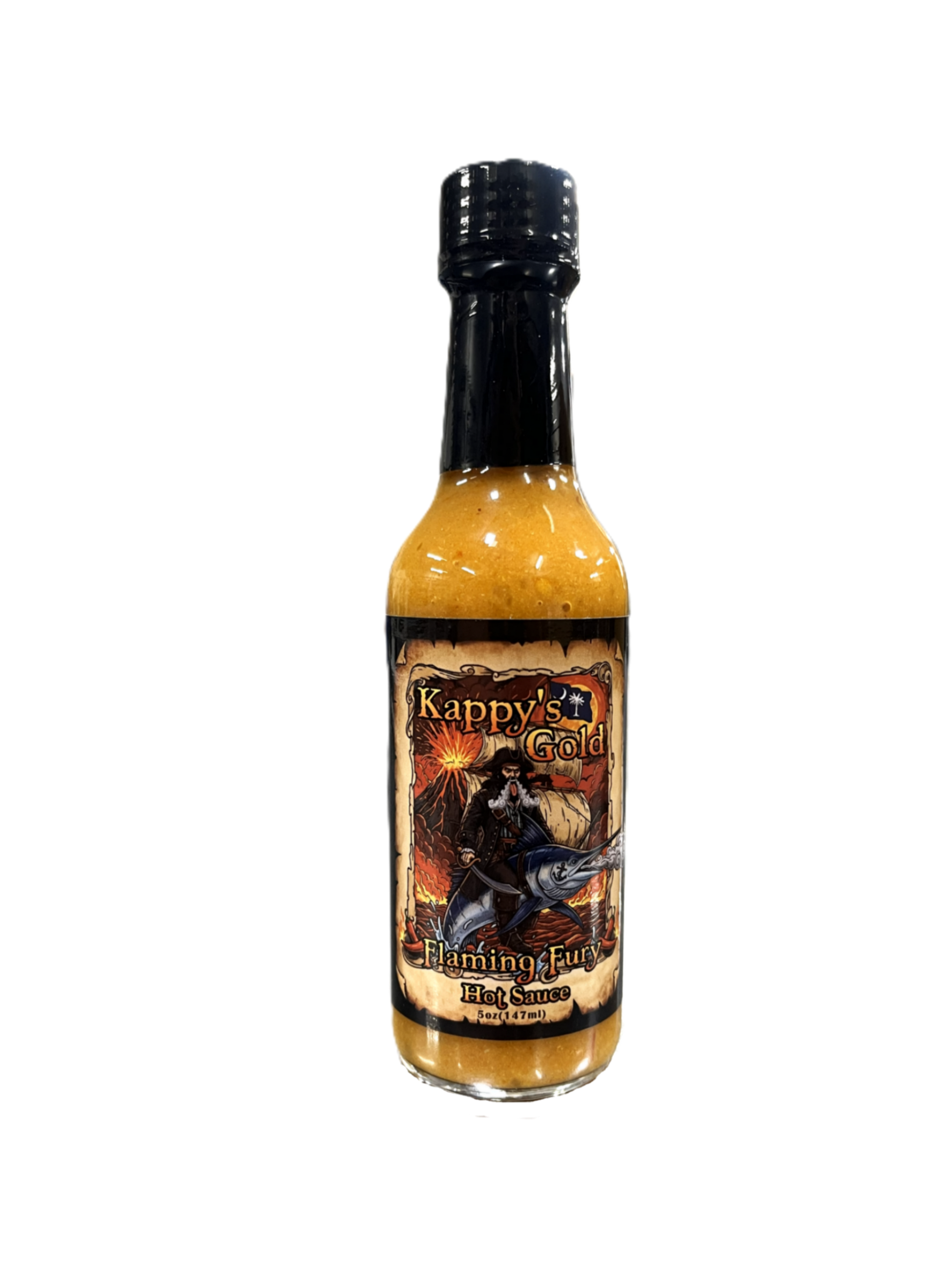Captain Kappy, the notorious pirate of the Eastern Seaboard was feared not only for his cutlass but for his infamous "Flaming Fury" hot sauce - A molten concoction born in the swamps of South Carolina, where ghost peppers and gator tears brewed under the moonlight. Legend says he discovered the recipe in a cursed bayou, scrawled on a map soaked in rum and blood. With every fiery drop, his enemies cough smoked and begged for mercy-not form his blade, but from the unbearable burn of his hot sauce. Sailors claimed you could feel the heat from two leagues away, and that one taste could turn a mutiny into a prayer meeting, In the end, it wasn't the fury of cannonballs or summoning krakens that carved his legend into the sea, but a bottle of liquid fire that made the bravest men weep.